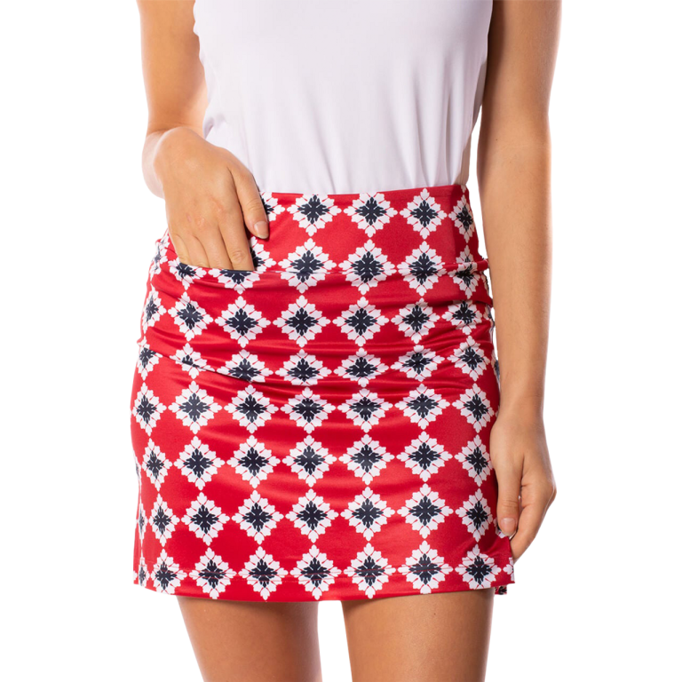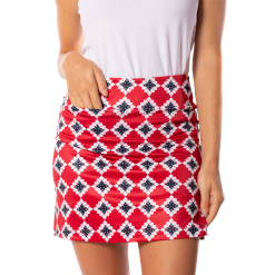This brand new styled Serendipity Pull-On Tech Skort is designed for the golf course. Golftini’s new design is offered in a fun red, white and blue print with a navy grosgrain ribbon trim on the back pocket. The 17.5” length with 3” contoured waistband and built-in, loose fitting shorts underneath extend the comfort and come in a wrinkle free construction. A hidden front tee pocket and back scorecard pocket provide room for the course necessities.