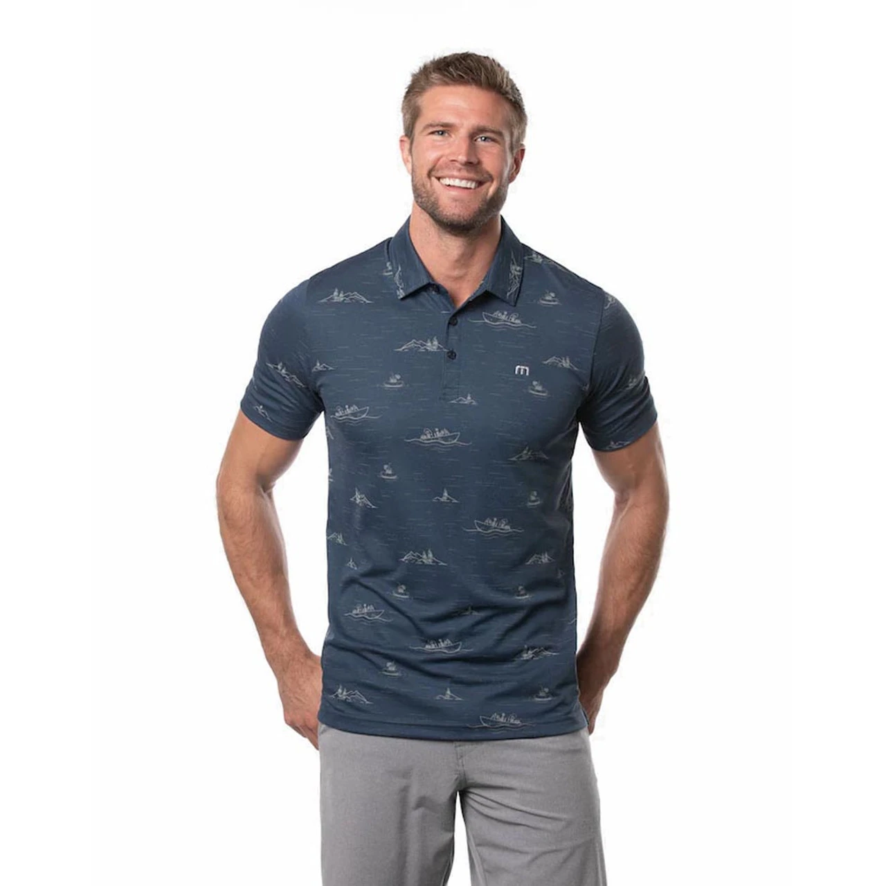 Lake day inspired, The Travis Mathew Fun and Games Polo is perfect for the golf course or the weekend. An all-over lake party print and built in collar stays keep you looking professional throughout your night.